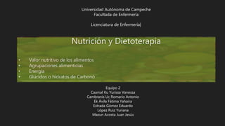 Este documento trata sobre la nutrición y la dietoterapia. Explica el valor nutritivo de los alimentos, las agrupaciones alimenticias principales y los carbohidratos o hidratos de carbono. Define los carbohidratos y explica su clasificación en monosacáridos, oligosacáridos y polisacáridos. También describe las funciones energéticas de los carbohidratos y su importancia como fuente principal de energía en la dieta humana.