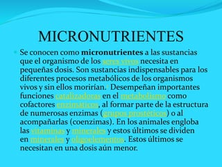 El documento habla sobre los micronutrientes y macronutrientes. Los micronutrientes son sustancias que el cuerpo necesita en pequeñas cantidades para procesos metabólicos y son indispensables para la vida. Incluyen vitaminas y minerales. Los macronutrientes proveen la mayor parte de la energía y son glúcidos, proteínas y lípidos. Algunos micronutrientes como vitaminas A y D se pueden almacenar en el hígado para periodos mayores a un año.