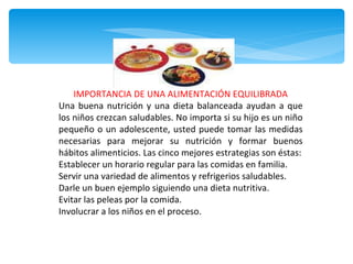 El documento destaca la importancia de una alimentación equilibrada y nutritiva para el crecimiento y desarrollo saludable de los niños. Señala cinco estrategias clave como establecer horarios de comidas regulares, servir una variedad de alimentos saludables y dar el ejemplo con una propia dieta balanceada. También explica que una mala nutrición puede ocasionar problemas de salud y retrasos en el desarrollo.