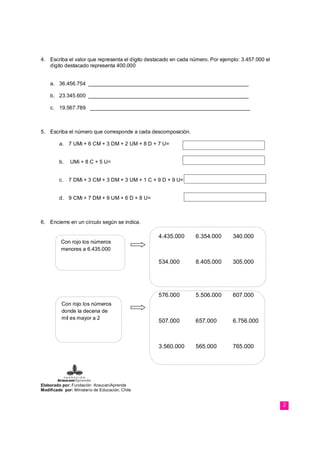 El documento presenta una serie de actividades relacionadas con la escritura y el valor posicional de números. Estas incluyen: 1) escribir números en palabras, 2) asignar números a expresiones numéricas, 3) identificar el valor que representa cada dígito en un número según su posición, 4) escribir números que cumplan con ciertas condiciones posicionales y 5) encerrar números según instrucciones específicas.