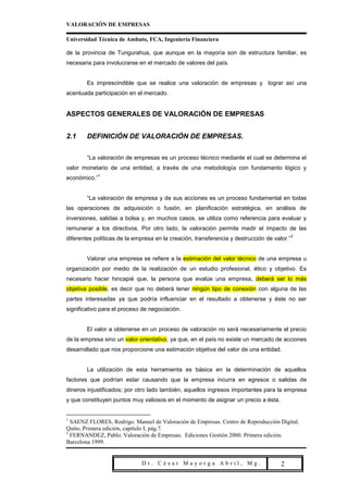 El documento trata sobre la valoración de empresas. Explica que la valoración de empresas es un proceso técnico para determinar el valor monetario de una entidad mediante metodologías fundamentadas. También define la diferencia entre el valor técnico de una empresa, que se basa en factores objetivos, y el precio de venta, que depende de negociaciones entre comprador y vendedor considerando factores subjetivos. Además, presenta los aspectos generales del proceso de valoración como su definición, esquema básico y las razones por las cuales se