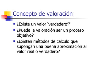 Este documento discute diferentes conceptos y métodos relacionados con la valoración de empresas. Explica que no existe un único valor verdadero de una empresa, sino que la valoración es un proceso subjetivo. Presenta los enfoques principales de valoración como el descuento de flujos de efectivo y los múltiplos, y analiza factores como los tipos de flujos a utilizar, el cálculo de tasas de descuento y la estimación de valores terminales.
