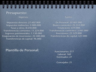 El documento proporciona información sobre el presupuesto y datos demográficos del Ayuntamiento de Boadilla del Monte, y resume las propuestas electorales de los principales partidos políticos en áreas como administración, educación, sanidad, empleo y cultura, evaluando cada propuesta según su coste, competencia y puntos.