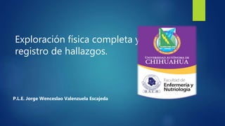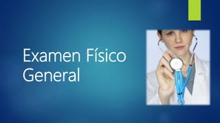 El documento describe los pasos y componentes de un examen físico completo. Consta de tres partes: examen físico general, examen físico regional y examen físico por sistemas. Incluye instrucciones sobre la preparación del paciente y el entorno, y describe los cuatro métodos básicos de exploración - inspección, palpación, percusión y auscultación - proporcionando detalles sobre su ejecución correcta. El objetivo es realizar un examen físico completo y registrar con precisión todos los hallazgos.