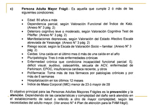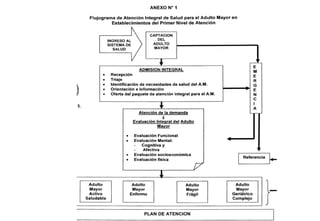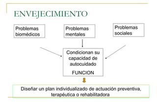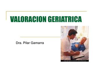 El documento describe la valoración geriátrica integral del adulto mayor. Explica que la valoración debe ser multidimensional e interdisciplinaria para evaluar las capacidades y problemas del paciente en los ámbitos clínico, funcional, mental y social. El objetivo es desarrollar un plan de tratamiento individualizado que mejore la calidad de vida y funcionalidad del anciano.