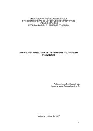 Este trabajo especial de grado, realizado por Juana Rodríguez Díaz, analiza la valoración probatoria del testimonio en el proceso civil venezolano, enfatizando la importancia del debido proceso en la toma de decisiones judiciales. La investigación incluye un estudio descriptivo sobre la naturaleza del testimonio, los sistemas de valoración probatoria y el papel del juez en la apreciación de la prueba testimonial. Se fundamenta en la revisión de doctrina y jurisprudencia para enriquecer el campo del derecho procesal en Venezuela.