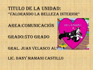 Este documento presenta una unidad educativa sobre valorar la belleza interior para estudiantes de 5to grado. La unidad enseñará a los estudiantes a apreciar el amor y la belleza interior mediante investigación, elaboración de proyectos y participación. Los estudiantes usarán procesadores de texto para crear afiches sobre la importancia del amor. El documento también incluye preguntas orientadoras, estrategias de evaluación y habilidades del siglo 21 que la unidad busca desarrollar en los estudiantes.