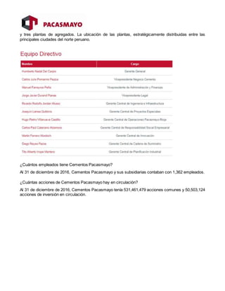 Cementos Pacasmayo se dedica a la fabricación y comercialización de cemento y otros materiales de construcción en el norte de Perú desde 1957. Actualmente cuenta con dos plantas de cemento, ocho plantas prefabricadas y siete plantas de concreto premezclado, estratégicamente ubicadas en las principales ciudades del norte. Entre 2015 y 2016, la compañía experimentó una caída del 46% en sus utilidades debido a la desaceleración de la industria de la construcción.