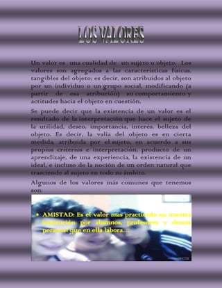 El resumen describe que un valor es una cualidad atribuida a un objeto por un individuo o grupo social que modifica su comportamiento hacia ese objeto. Los valores surgen de la interpretación subjetiva que hace una persona sobre la utilidad, deseo o importancia de un objeto. Algunos valores comunes mencionados son la amistad, el amor, la tolerancia, el respeto y la honestidad.