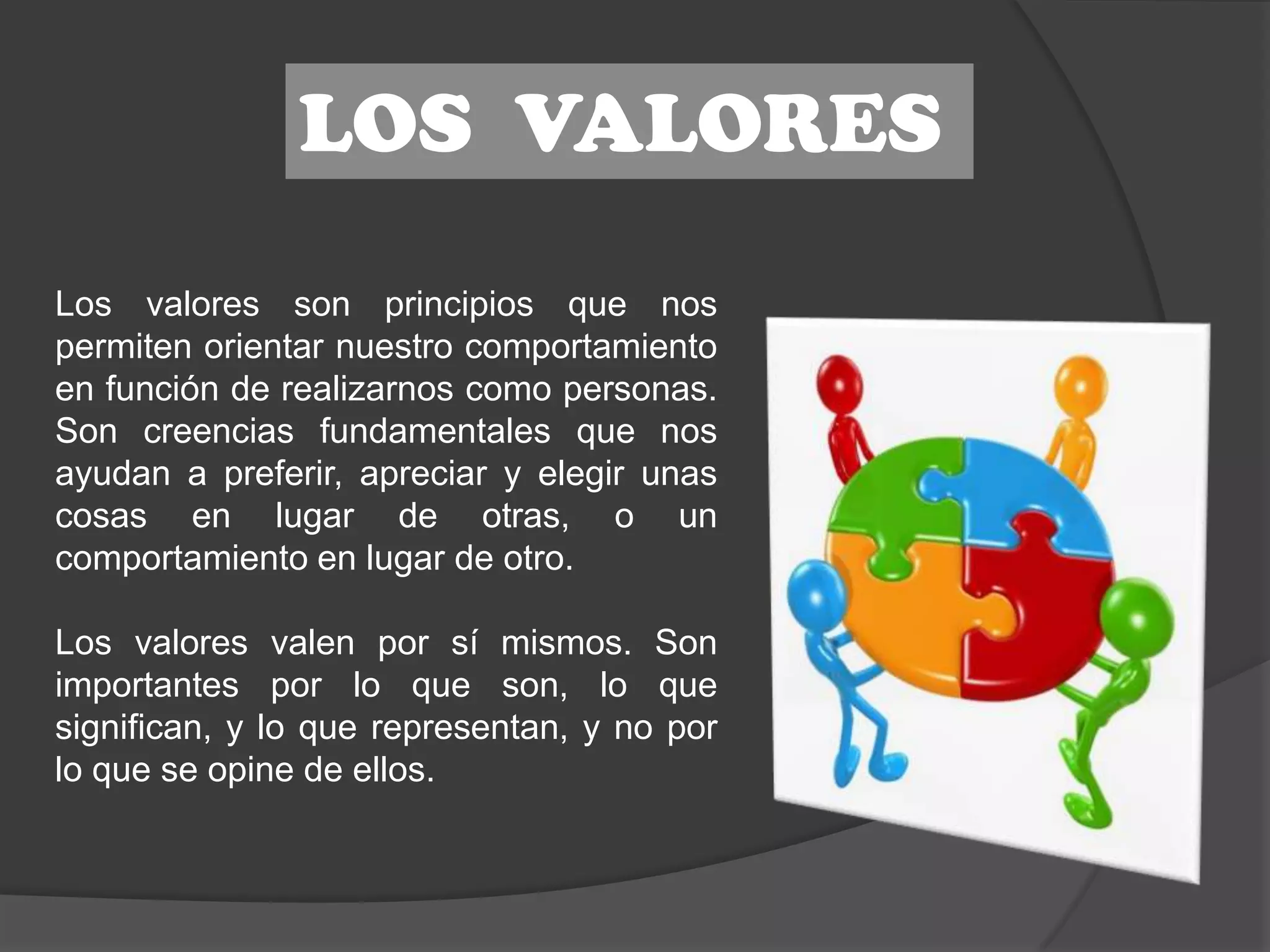 Este documento describe los valores como principios que guían el comportamiento humano y ayudan a las personas a elegir entre opciones. Explica que los valores son creencias fundamentales que determinan lo que apreciamos y preferimos. Además, señala que los valores son importantes por su significado intrínseco y no por las opiniones de otros sobre ellos.