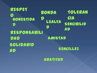 El documento describe varios valores fundamentales como la conciencia, la verdad y la libertad. Estos valores guían el comportamiento humano hacia el respeto de los derechos de los demás y la construcción de relaciones armoniosas mediante el juicio moral y el dominio de la voluntad sobre los instintos.