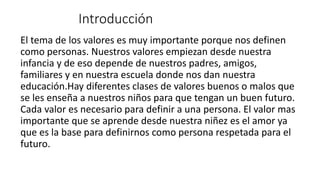 Este documento trata sobre los valores y cómo se aprenden desde la niñez. Explica que los valores nos definen como personas y dependen de la familia, amigos y escuela. Identifica valores como la honestidad, sensibilidad, gratitud y humildad. Señala que los valores universales se enseñan desde temprana edad por la familia, escuela y grupos sociales. Concluye que valores como el amor y la humildad son esenciales para tener una vida responsable y con propósito.