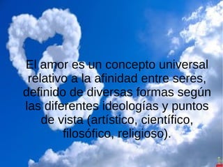 El documento discute varios conceptos relacionados con las relaciones humanas como el amor, la amistad, el compañerismo, el respeto, la confianza y la alegría. Define estas ideas de acuerdo a diferentes perspectivas como la filosófica, religiosa y científica y describe la naturaleza de las relaciones entre individuos que estas implican como la afinidad, el apoyo mutuo y la consideración del valor del otro.