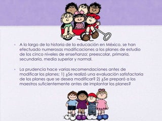 El documento analiza las modificaciones a los planes de estudio en México a lo largo de la historia, enfatizando la importancia de realizar evaluaciones adecuadas y preparar a los maestros antes de implementar cambios. Se discute la formación de valores morales en la educación, destacando que estos valores son fundamentales para la vida humana y deben ser promovidos por los educadores. Además, se mencionan diversos esfuerzos históricos por integrar valores morales en la educación, así como las críticas a la falta de consideración de las recomendaciones para el cambio de planes de estudio.