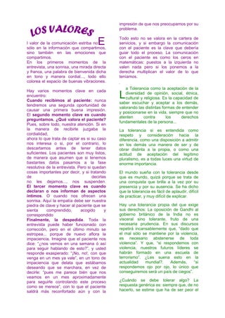 El documento habla sobre la importancia de la comunicación, la tolerancia y el respeto en las relaciones interpersonales. Resalta que la comunicación con el paciente es fundamental y que pequeños gestos como una sonrisa al inicio de la conversación pueden marcar una buena impresión. También enfatiza que la tolerancia requiere aceptar diferentes puntos de vista y que el respeto implica comprender a los demás aunque no estemos de acuerdo. Finalmente, destaca que la armonía es un valor clave para las familias y la sociedad y que al cultivar valores como la