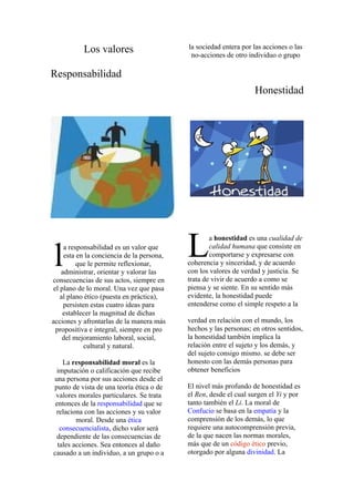 El documento trata sobre los valores de la responsabilidad, honestidad, laboriosidad, confianza y autoridad. Define cada valor de forma concisa resaltando sus aspectos más importantes como la reflexión sobre las consecuencias de los actos para la responsabilidad, comportarse con sinceridad para la honestidad, realizar las tareas con esmero para la laboriosidad, tener seguridad en el funcionamiento de sistemas para la confianza y ejercer influencia legítima para la autoridad.