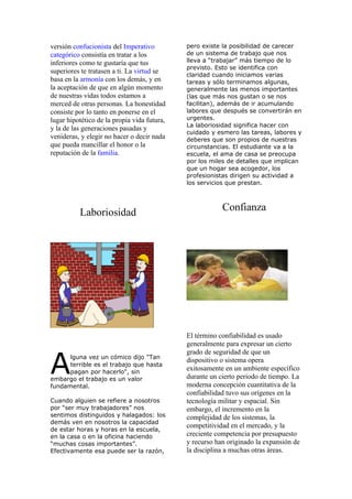El documento trata sobre los valores de la responsabilidad, honestidad, laboriosidad, confianza y autoridad. Define cada valor de forma concisa resaltando sus aspectos más importantes como la reflexión sobre las consecuencias de los actos para la responsabilidad, comportarse con sinceridad para la honestidad, realizar las tareas con esmero para la laboriosidad, tener seguridad en el funcionamiento de sistemas para la confianza y ejercer influencia legítima para la autoridad.