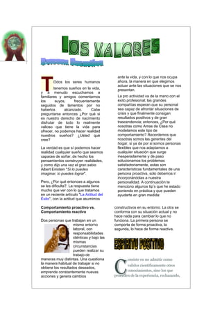 El documento discute la importancia de la actitud proactiva vs reactiva, destacando que las personas proactivas cuestionan el status quo y generan cambios constructivos, mientras que las personas reactivas se conforman con la situación actual. También resalta la importancia de pensar de manera positiva para tener éxito profesional y relaciones personales saludables, en lugar de pensamientos negativos que pueden afectar la salud y el bienestar. Finalmente, enfatiza que la comprensión y la serenidad son actitudes valiosas para enfrentar los