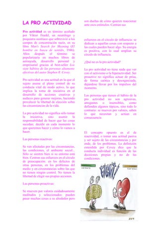 La pro actividad implica asumir el control de la propia conducta de manera activa mediante la toma de iniciativa y responsabilidad sobre las acciones propias. Las personas proactivas se centran en aquello sobre lo que pueden influir y toman decisiones basadas en valores, mientras que las personas reactivas se ven afectadas por las circunstancias externas y se centran en lo que está fuera de su control. Ser proactivo no significa ser hiperactivo sino asumir la libertad de elección sobre las circunstancias.
