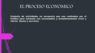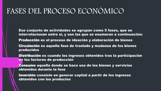 El documento describe el proceso económico y sus diferentes fases. El proceso económico consiste en un conjunto de actividades que se realizan en secuencia para satisfacer necesidades humanas y crear bienes y servicios. Estas actividades se agrupan en cinco fases principales: producción, circulación, distribución, consumo e inversión.