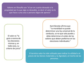Este documento discute la naturaleza y características de los valores. Define valores como aquello que hace que algo sea digno de aprecio o deseable. Explora diferentes dominios de valores como la ética, estética y religión. También describe que los valores se presentan de forma jerárquica y son interdependientes, objetivos, absolutos y universales. Finalmente, propone algunos principios para determinar qué valor debe prevalecer en diferentes circunstancias.