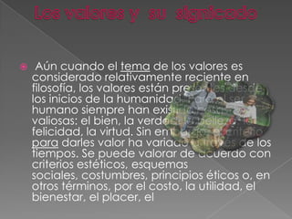 Los valores han existido desde el inicio de la humanidad, influenciando las decisiones y acciones humanas a lo largo del tiempo. Se clasifican en valores personales, familiares, socio-culturales, materiales y espirituales, cada uno desempeñando un papel fundamental en la vida y moralidad del individuo. La jerarquía de estos valores varía según el contexto, afectando cómo las personas toman decisiones y se relacionan con los demás.