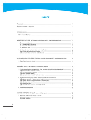 La propuesta de formación ética se divide en dos partes: la fundamentación teórica y las orientaciones metodológicas. La fundamentación teórica aborda el desarrollo del ser humano y su comportamiento ético desde perspectivas filosóficas, psicológicas y pedagógicas, asumiendo valores como la justicia, la libertad, el respeto y la solidaridad. Las orientaciones metodológicas presentan estrategias generales y específicas por área curricular que pueden incorporarse a las sesiones de aprendizaje.