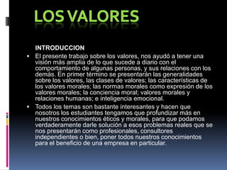 Este documento presenta una introducción sobre los valores y las clases de valores. Explica que el trabajo ayudó a los estudiantes a comprender mejor los problemas éticos y morales que enfrentarán como profesionales. A continuación, define valores como la puntualidad, la paciencia, el respeto, la felicidad, la amistad, la sencillez y la solidaridad.