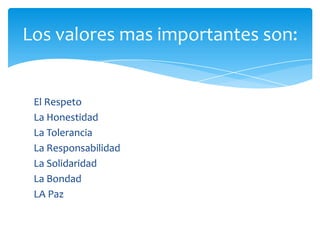 Este documento describe los valores más importantes para el desarrollo humano como el respeto, la honestidad, la tolerancia, la responsabilidad, la solidaridad, la bondad y la paz. Explica que los valores dignifican la existencia humana y son fundamentales para educar moralmente a las personas y enseñarles a comportarse de manera adecuada.