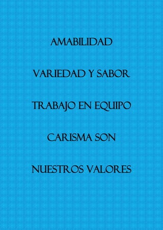 Nuestros valores fundamentales son la amabilidad, variedad y sabor, trabajo en equipo y carisma.