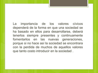 El documento describe varios valores cívicos importantes para el desarrollo de una sociedad como el esfuerzo, la tolerancia, la equidad, la libertad, el respeto, la solidaridad, la justicia, la paz y la responsabilidad. Explica brevemente el significado de cada valor y por qué es importante que una sociedad los tenga presentes y los fomente entre las nuevas generaciones para mantenerse estable.