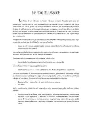 2) Los hijos de un labrador peleaban constantemente hasta que su padre les enseñó que, al igual que un haz de leña es más fuerte cuando está atado, ellos también lo serían si se unían.