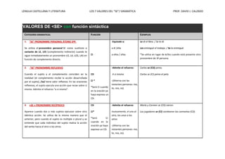 El documento describe los 7 valores sintácticos y no sintácticos que puede tomar el pronombre "se" en español. Explica cada valor a través de su categoría gramatical, función y ejemplos. Los valores sintácticos son: pronombre personal átono, pronombre reflexivo, pronombre recíproco. Los no sintácticos son: morfema pronominal, dativo ético, pasivo reflejo e impersonal. Finalmente, propone ejercicios para identificar el valor de "se" en diferentes oraciones.
