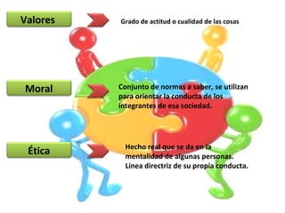 Este documento describe diferentes tipos de valores, incluyendo valores morales, valores humanos, el proceso de formación de valores, y una clasificación de valores. Explica que los valores son normas que guían la conducta en una sociedad y que los valores morales y humanos promueven la dignidad de las personas. Además, resume el proceso de formación de valores como descubrir situaciones, elegir libremente un valor, y expresarlo a través de la conducta.