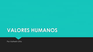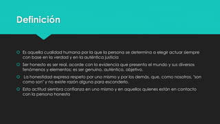 Este documento define y describe varios valores humanos importantes como la honestidad, la puntualidad y la responsabilidad. Explica que los valores humanos conducen al bien moral y perfeccionan al ser humano al hacerlo más humano. Los valores morales solo se pueden alcanzar a través del esfuerzo y la perseverancia personal.