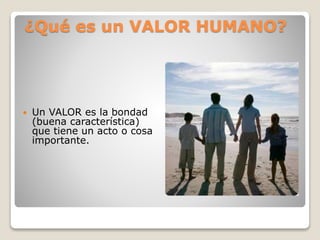 Este documento presenta una capacitación sobre valores humanos. Explica que un valor es una buena característica importante de un acto o cosa. Luego detalla diferentes tipos de valores, incluyendo valores religiosos, morales, intelectuales, estéticos, vitales y útiles. También define los disvalores como la falta de una buena característica importante. Finalmente, pide a los lectores que elaboren una presentación sobre los disvalores.