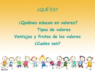 Este documento presenta una discusión sobre los valores. Define valores como aquello que hace buenas las cosas y que son deseados por la voluntad e inteligencia humanas. Explora quiénes educan en valores, señalando que cada persona se forma a sí misma descubriendo valores a través de experiencias en la familia, escuela y otros medios. También cubre diferentes tipos de valores como espirituales, morales, personales y sociales, y las ventajas de interiorizar valores como guías para la conducta.