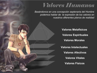 El documento describe los valores fundamentales del ser humano organizados en siete planos de realización: físico, vital, afectivo, intelectual, moral, espiritual y metafísico. Propone que desarrollando armoniosamente estos valores a través del cultivo de cualidades como la bondad, la verdad y la belleza, el ser humano puede alcanzar su plena realización.