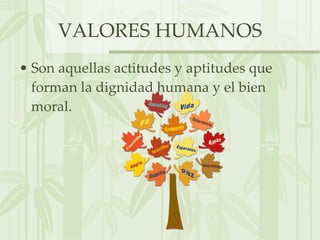 El documento define y describe varios valores humanos importantes como el amor, respeto, amistad, tolerancia, responsabilidad, alegría, y solidaridad. Explica que estos valores forman la dignidad humana y permiten que las personas se relacionen mejor y continúen mejorándose a sí mismas.