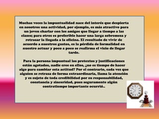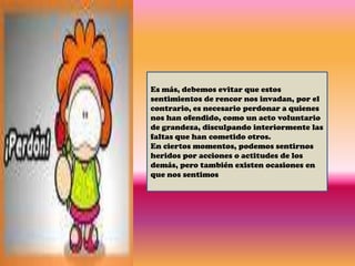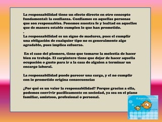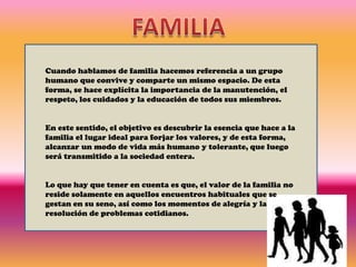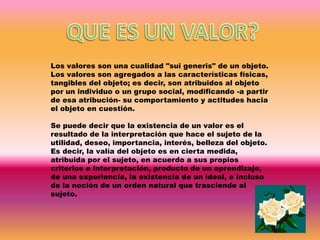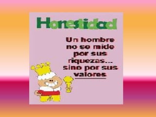 El documento habla sobre varios valores importantes como la honestidad, puntualidad, responsabilidad, familia, respeto, perdón, aprender, comunicación, amor y amistad. Explica qué son estos valores, por qué son importantes y cómo practicarlos en la vida diaria.