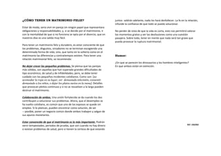 El documento discute cómo mantener un matrimonio feliz. Sugiere no dejar que los pequeños problemas crezcan, colaborar para resolver problemas en lugar de culparse mutuamente, y estar convencidos de que el matrimonio es lo más importante a pesar de las dificultades que puedan surgir. También recomienda no tomarse los problemas demasiado en serio y mantener el sentido del humor.