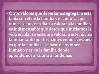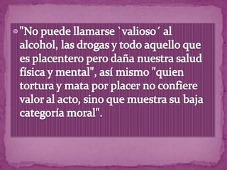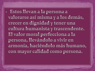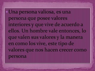 El documento contrasta características positivas como la honestidad, compasión y valentía frente a características negativas como la deshonestidad, egoísmo e intolerancia. También promueve detenerse a disfrutar y agradecer lo que se tiene en lugar de siempre querer más.