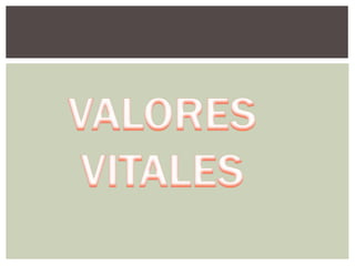 Los valores son principios que guían el comportamiento de una persona para alcanzar su realización personal. Reflejan los intereses, sentimientos y convicciones más importantes de un individuo. Los valores vitales son las creencias fundamentales de una persona que dan sentido a su vida y sustentan sus decisiones, especialmente en situaciones de enfermedad o muerte. Algunos valores vitales clave son lo saludable, lo insaludable, lo fuerte y lo débil.