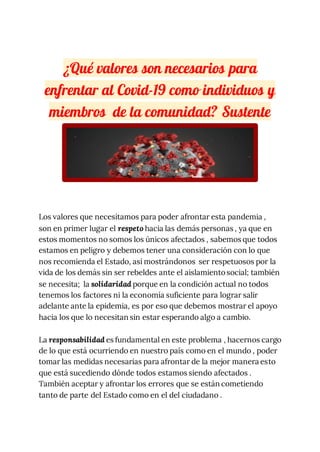 Los valores necesarios para enfrentar la pandemia de Covid-19 incluyen el respeto por los demás, la solidaridad y la responsabilidad. El respeto significa seguir las recomendaciones del gobierno para proteger a otros. La solidaridad es importante para apoyar a quienes lo necesitan. La responsabilidad implica tomar medidas para controlar la propagación del virus y aceptar los errores cometidos.