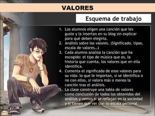 El documento presenta información sobre los valores. Define valores como cualidades que permiten ponderar el valor ético o estético de las cosas. Explica que una escala de valores es el conjunto de opciones que las personas consideran fundamentales, con una opción fundamental en primer lugar. Clasifica los valores en éticos, espirituales, materiales, estéticos, metafísicos, físicos, afectivos e intelectuales. También presenta ejemplos de temas y valores encontrados comúnmente en canciones sobre relaciones de pareja, esta sociedad y el mundo.