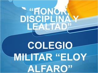 Este documento describe los valores y actitudes que se busca reforzar en los estudiantes del Colegio Militar "Eloy Alfaro", incluyendo el honor, la disciplina y la lealtad. Define cada uno de estos valores y explica cómo se relacionan con la autoestima, el respeto y la confianza. El objetivo es que los estudiantes apliquen estos valores en sus actividades escolares, familiares y sociales.