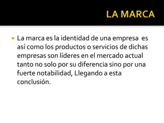 Una marca líder depende de cuatro elementos: un elemento visual como un logotipo, una idea que represente a la empresa, una proposición que atraiga al público y una diferenciación a través de características especiales. Una marca líder se posiciona por la experiencia que ofrece al consumidor, lo que define su valor. Las empresas crean marcas líderes a través de estrategias de marketing que transmitan su promesa y acumulen el valor de la marca.