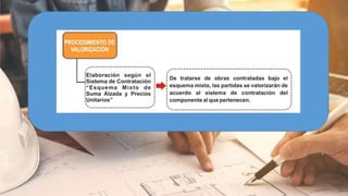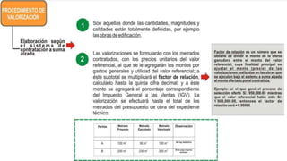 El documento explica los conceptos y procedimientos relacionados con las valorizaciones de obras. Define la valorización como la cuantificación económica del avance físico en la ejecución de una obra en un período determinado. Describe el proceso de valorización, que incluye la valorización del avance físico, reajuste de precios y amortizaciones de adelantos. También cubre temas como los tipos de valorizaciones, adelantos, aplicación de reajustes y organización del expediente de valorización.