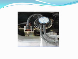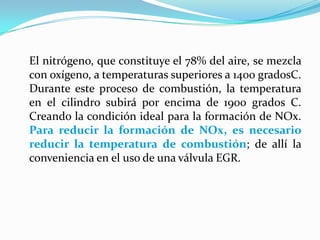 La válvula EGR recircula los gases de escape hacia la admisión para diluir la mezcla aire/combustible y así reducir las temperaturas de combustión. Esto evita la formación de óxidos de nitrógeno (NOx) que son contaminantes. La válvula se activa mediante vacío cuando el motor está caliente para permitir el paso de los gases de escape, pero se desactiva cuando el motor está frío para prevenir apagones. Existen dos tipos principales de válvula EGR que funcionan de manera opuesta para lograr el mismo objet