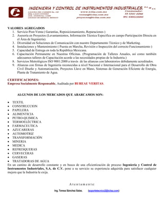 La carta resume la misión, visión y valores de una empresa de instrumentación industrial mexicana. La empresa se ha posicionado como líder en el sector a través de su enfoque en la calidad, innovación y servicio al cliente. Su misión es proveer instrumentos industriales de alta calidad y su visión es mantenerse a la vanguardia tecnológica para satisfacer las necesidades de sus clientes.